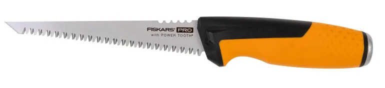 Fiskars Pro PowerTooth™-pistosaha tekee kipsilevyjen leikkaamisesta nopeaa ja tehokasta tukevan ja huipputerävän kiinteän terän ansiosta. Varustettu vyökiinnitteisellä tupella. Kolmoishiottu terä leikkaa nopeasti ja tehokkaasti ja sen kitkaa vähentävä pinnoite ehkäisee kipsipölyn tarttumista terään ja suojaa sitä ruostumiselta.
