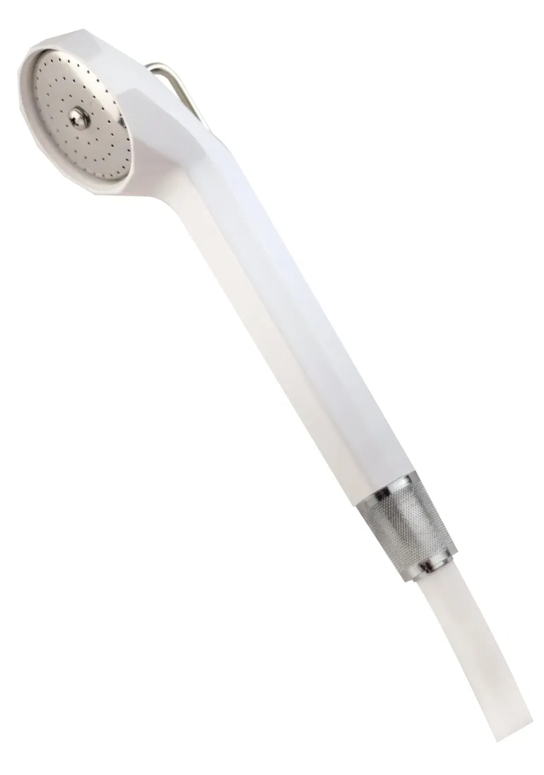 Valkoinen käsisuihku ripustuslenkillä, valmistettu muovista, mukana kromattu siivilä ruostumatonta terästä. Suihkussa on yksi suihkutyyppi ja G15-liitäntä.