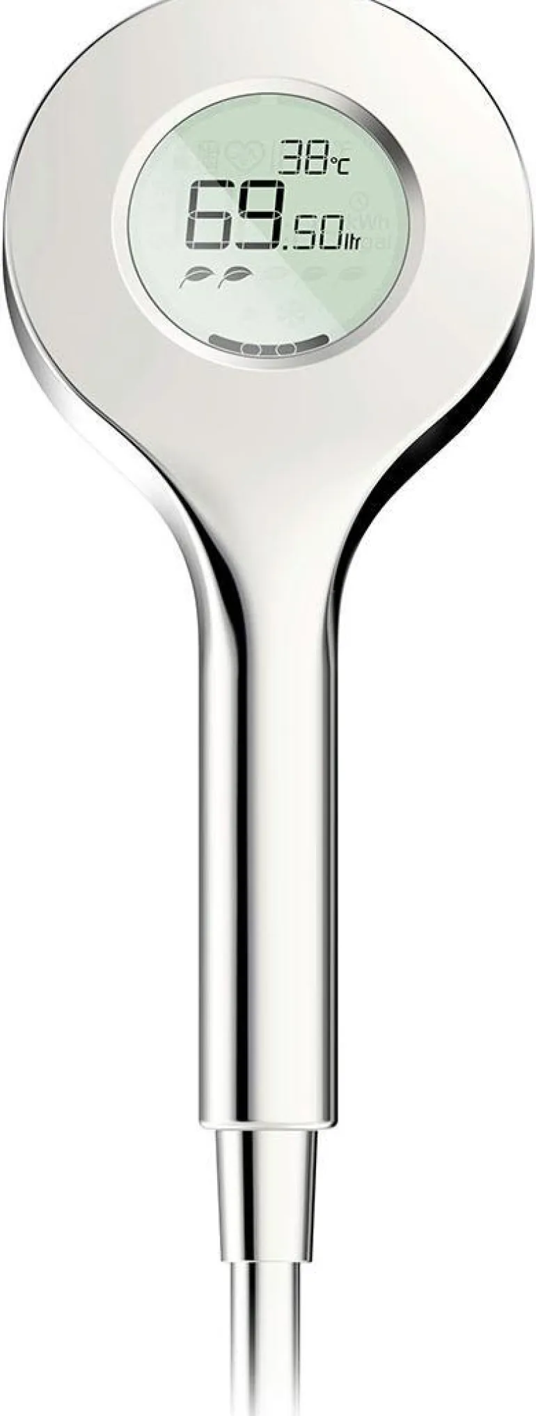 Digitaalinen, oman energiansa tuottava käsisuihku bluetooth-liitännällä Oras App -sovelluksen kautta – näyttää todellisen kulutuksen suoraan käsisuihkun näytöltä – vettä ja energiaa säästävä.