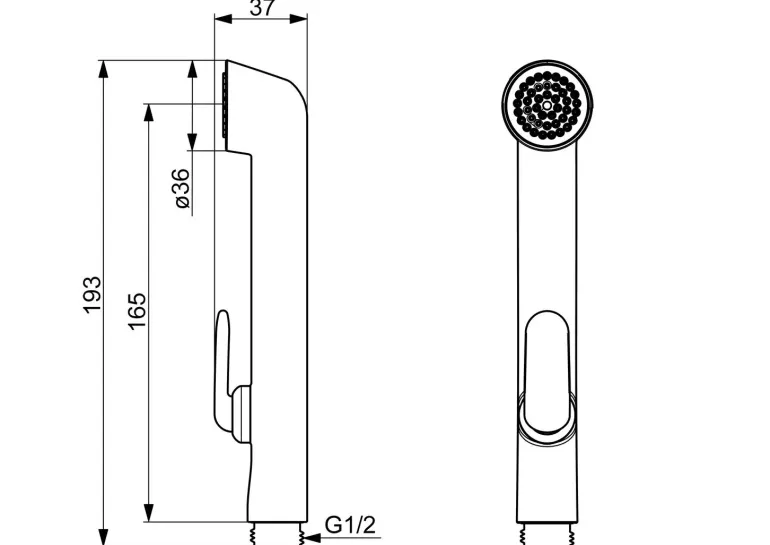 Automaattisesti sulkeutuva G15-käsisuihku muovia. Ilman seinäkiinnikettä. Pituus 155 mm.