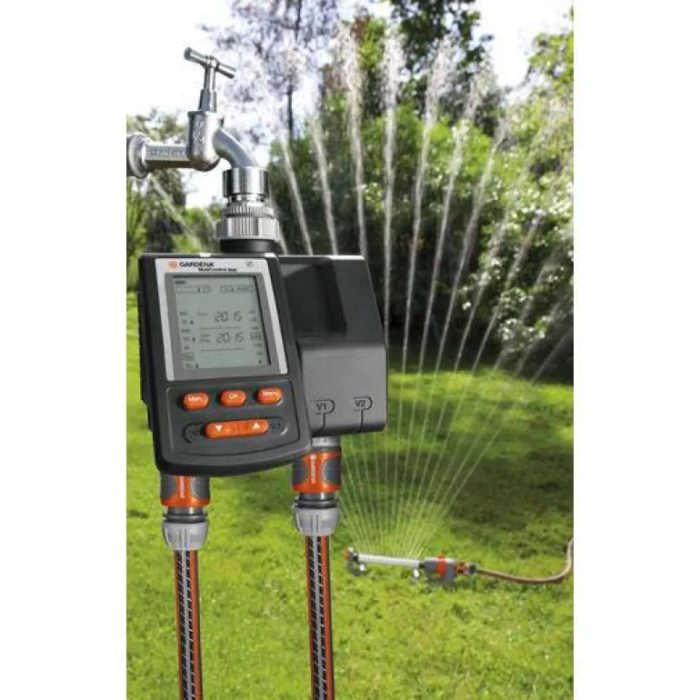 Toiminnot voidaan valita napinpainalluksella. Intuitiivisen toiminnan ja kastelutietojen vaiheittaisen näyttämisen ansiosta laite on helppokäyttöinen, ja kaikki tiedot esitetään selvästi suurella näytöllä. Kuhunkin liitäntään voidaan liittää vettä säästävä GARDENA-maankosteusanturi. Anturin älykäs toiminta keskeyttää tai estää automaattisesti kastelun, kun maaperä on riittävän kostea tai alkaa sataa. Molempia liitäntöjä voidaan ohjata myös anturilla. Oikealla ohjelmalla kastelu alkaa automaattisesti, kun maankosteusanturi havaitsee maan olevan kuiva. Kastelunohjain soveltuu hanoille, joiden kierteet ovat 26,5 mm (G 3/4) ja 33,3 mm (G1) ja käyttöpaine 0,5–12 baaria. Kastelunohjain toimii 9 voltin alkaliparistolla noin vuoden. Pariston varaustason näyttö ilmaisee, milloin paristo on vaihdettava. Paristo ei sisälly toimitukseen.