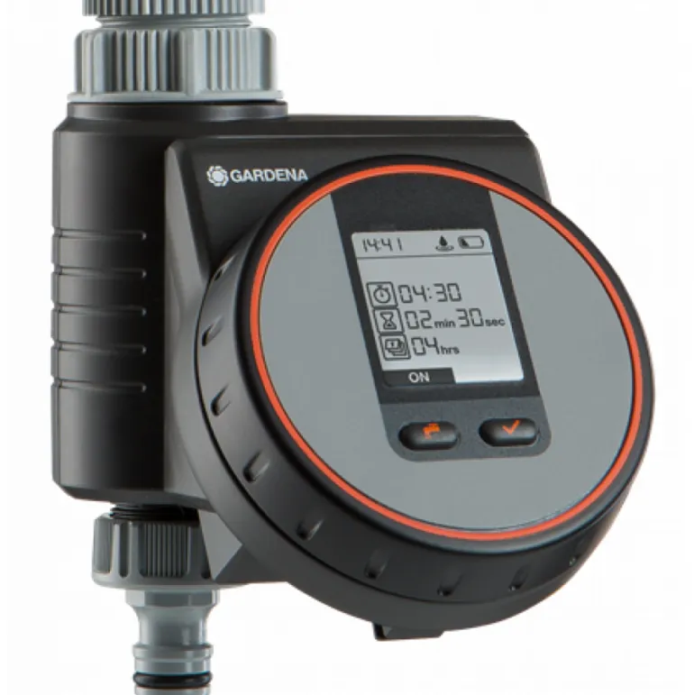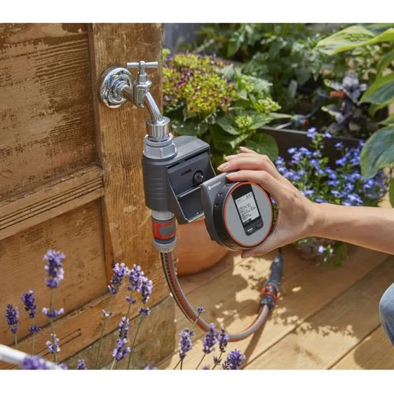 Kastelunohjain, joka mahdollistaa joustavan ja automaattisen kastelun parvekkeilla, kattoterasseilla tai terasseilla. Ohjain on akkukäyttöinen, se voidaan kytkeä suoraan hanaan ja sitä voidaan käyttää helposti innovatiivisen pyöritä ja paina -toiminnon ansiosta.