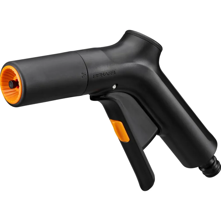 Fiskars Solid™ -kastelupistooli kastelukuviolla (suora suihku ja huuhtelu). Kevyessä ja helppokäyttöisessä kastelupistoolissa on etukytkin vedenvirtauksen säätämiseen, jonka voi lukita pitkäkestoisessa käytössä. Pikaliitin on yhteensopiva myös muunmerkkisten tuotteiden kanssa.