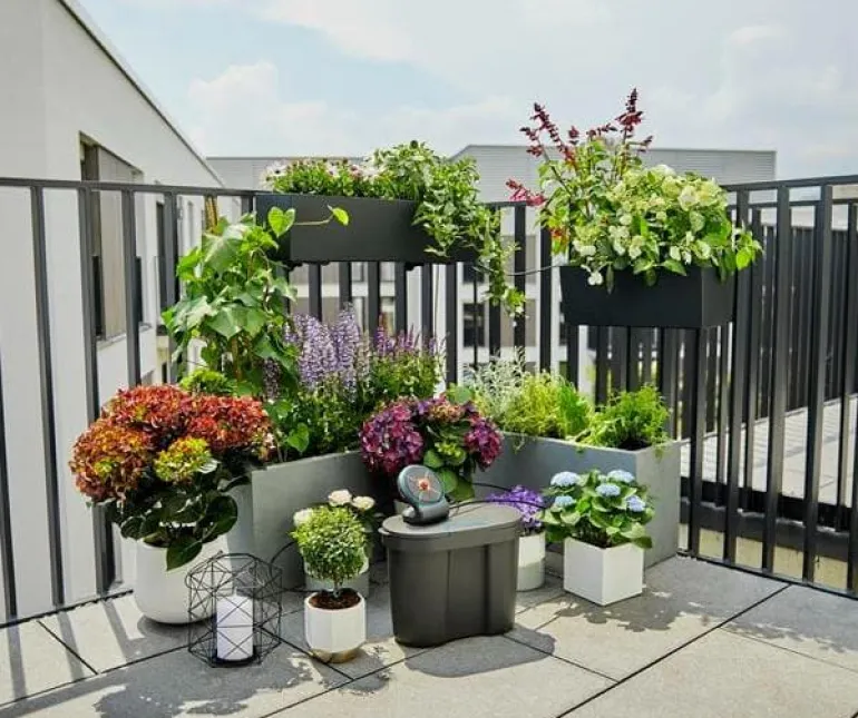 Varmista, että kasvisi saavat parasta hoitoa, kun olet poissa. Aurinkoenergialla toimiva kastelusarja ei vaadi lainkaan sähköliitäntää. Aurinkopaneelin ja ladattavien akkujen yhdistelmä takaa luotettavan kastelun koko kauden ajan. Voit valita 14:sta ennalta määritellystä kasteluohjelmasta kasveillesi sopivimman. Voit laittaa enemmän vettä vaativille kasveille useamman suuttimen. Integroidun pumpun ja siihen yhdistetyn vesisäiliön ansiosta vesihanaa ei tarvita. Kaikki tarvittavat osat, mukaan lukien paristot, ovat mukana, joten kastelujärjestelmä voidaan asentaa ja ottaa käyttöön välittömästi. AquaBloom-sarja, jonka mukana toimitetaan vesisäiliö, on käytännöllinen ja ympäristöystävällinen tapa kasteluun. 10,5 litran vesisäiliön vesi riittää jopa 12 päivän ajaksi. Voit halutessasi yhdistää useampia säiliöitä toisiinsa. Vesisäiliö on valmistettu 80-prosenttisesti kierrätysmateriaalista, joten se on kestävä valinta kasteluun. Vettä imevä suodatin voidaan kiinnittää säiliön pohjaan, mikä mahdollistaa optimaalisen veden hyödyntämisen. Tyhjää vesisäiliötä voidaan käyttää kastelukauden ulkopuolella osien säilytykseen. GARDENA AquaBloom -lomakastelusarjan moderni ja innovatiivinen muotoilu tekee järjestelmästä ajattoman, ja se sopii hyvin käytettäväksi niin terassilla kuin parvekkeella.