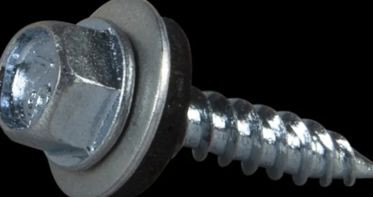 ESSVE-kateruuvi 4,8 x 25 mm, terävä kärki, galvanoitu teräsaluslaatta ja EPDM-tiiviste. Ruuvi on tarkoitettu profiloidun pellin asennukseen puualustaan.