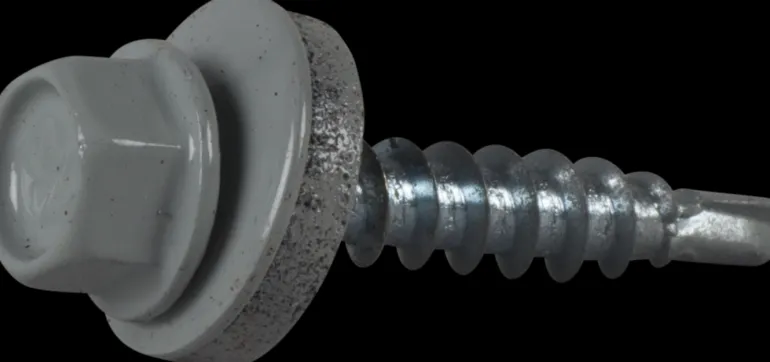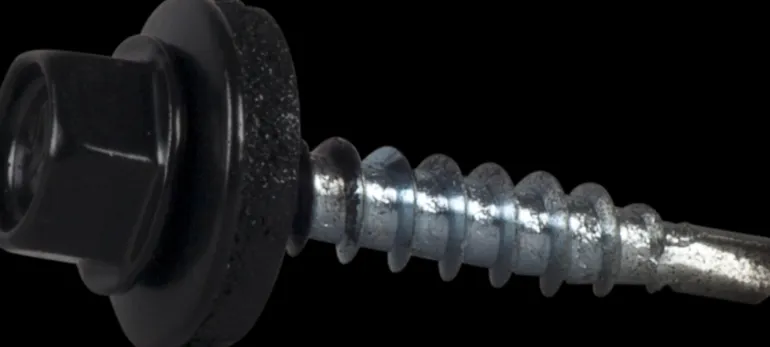 ESSVE-kateruuvi 4,8 x 28 mm porakärjellä, kuusiokanta, galvanoitu teräsaluslaatta ja EPDM-tiiviste. Tarkoitettu profiloidun pellin asennukseen puualustaan sekä pellin asennukseen peltiin (limitys).
