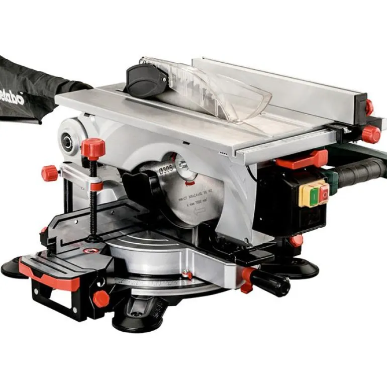 Katkaisu- ja jiirisaha, jossa on lisäksi pöytäpyörösahatoiminto pitkittäissahauksia varten.
