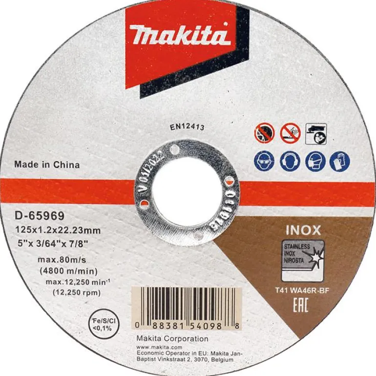 Makita D-65969-12 on katkaisulaikka, jonka halkaisija on 125 mm ja reiän halkaisija 22,23 mm. Leikkauskiekon paksuus on 1,2 mm, ja se toimitetaan 12 pakkauksena.