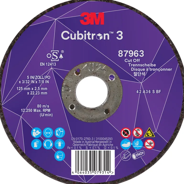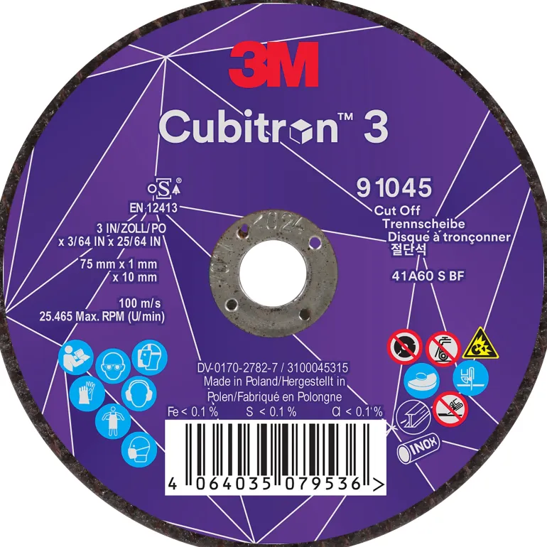 3M™ Cubitron™ 3 katkaisulaikalla teet kohtisuorat leikkaukset käyttämällä laikan ulkoreunaa. Laikka on ihanteellinen valinta metallin leikkaamiseen esim. ajoneuvo- ja laivateollisuudessa. Laikalla katkaiset ruostumattomat teräsputket, pakoputket, puristimet, ruostuneet kiinnikkeet ja paljon muuta.