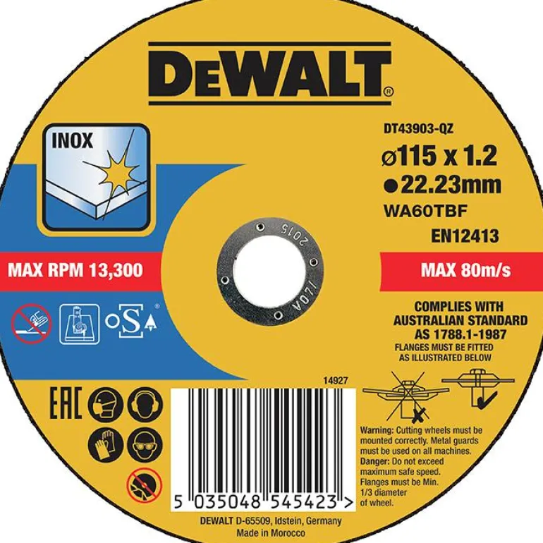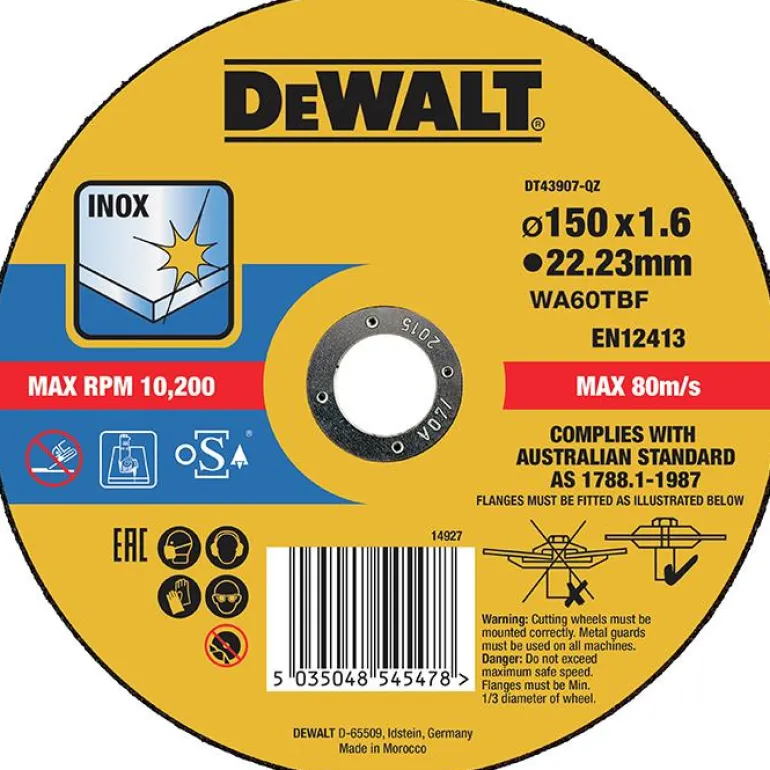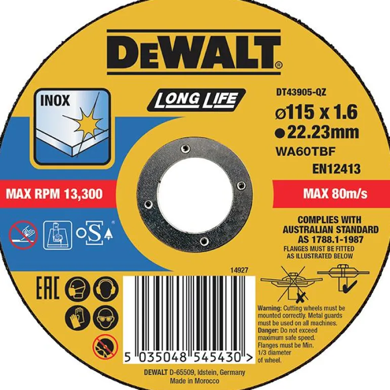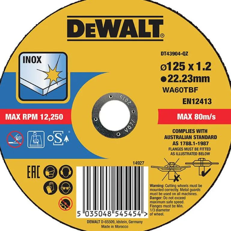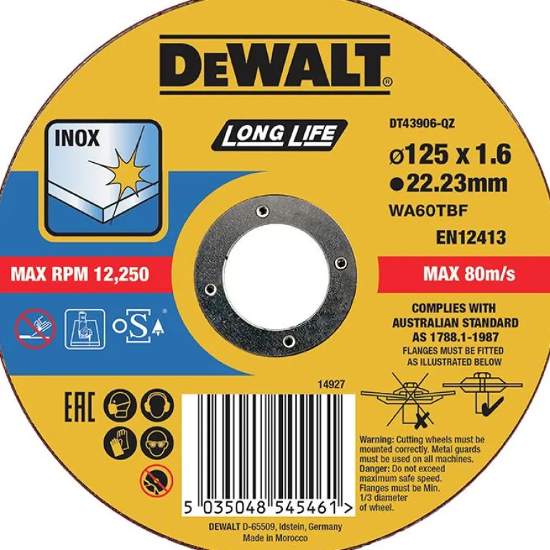 DEWALT DT43906 on katkaisulaikka (1 kpl/pakkaus) ruostumattomalle teräkselle (Inox, Long Life). Mitat 125×1,6 mm. Laikan reiän halkaisija 22,23 mm.