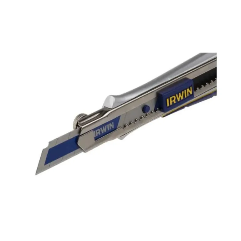 Irwin ProTouch on kestävä ja ominaisuuksiltaan monipuolinen katkoteräveitsi, jossa on 18 mm leveä bimetalliterä ja terän kärjessä lukitusruuvi, joka estää terän irtoamisen äärimmäisessä kuormituksessa. Veitsessä on myös kahden terän lipas, kestävä alumiininen kahva ruostumattomasta teräksestä valmistetulla teränohjaimella, saranoitu päätykotelo ja ProTouch-kahva, joka takaa tukevan otteen ja parantaa käyttömukavuutta.