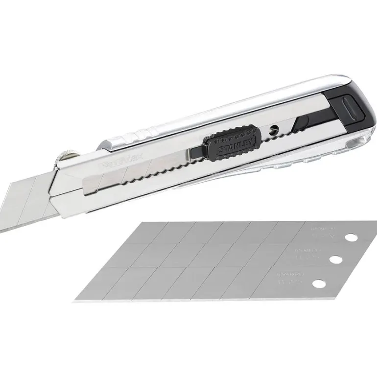 Katkoteräveitsi, jonka terän leveys on 25 mm. Rihlattu kahva parantaa pitoa ja estää käden liukumisen. Erikoispitkä kotelo mahdollistaa käytön kahdella kädellä, kun tarvitaan lisää voimaa. Integroitu teränkatkaisin katkaisee terän mukavasti ja turvallisesti, runko ruostumatonta terästä.
