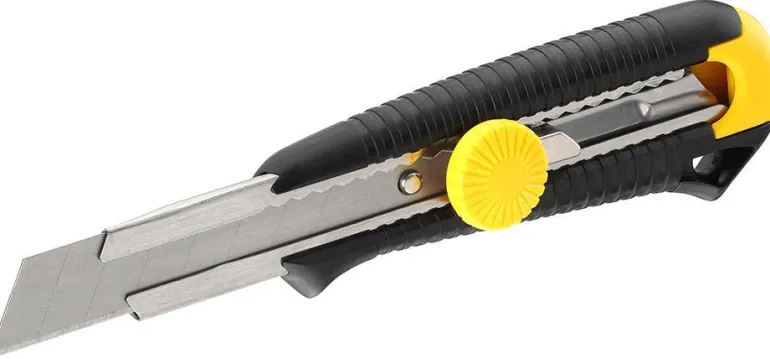 Ergonomisella kahvalla varustettu katkoteräveitsi joustavasta elastomeerista takaa maksimaalisen mukavuuden ja pitkän käyttöiän. Teränpidikkeet ja teräohjain on valmistettu ruostumattomasta teräksestä, mikä mahdollistaa sujuvan käytön ja paremman lujuuden.