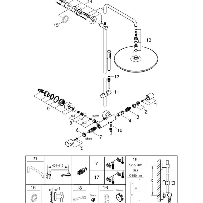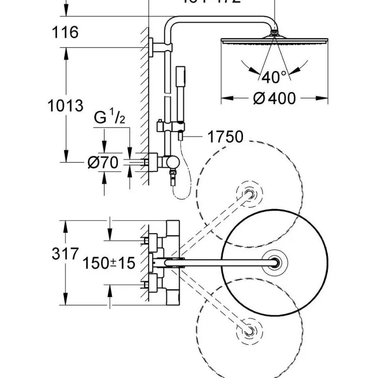 Yläsuihkuun on asennettu pallonivel, jonka kääntökulma on ± 20°, ja Twistfree estää suihkuletkun kiertymisen. Puhdistusta helpottavat GROHE StarLight -kromipinnoite, sisäänrakennettu WaterGuide ja SpeedClean-kalkinpoistojärjestelmä. Suihkujärjestelmän minimivirtausnopeus on 7 l/min ja vähimmäispaine 1,0 bar.