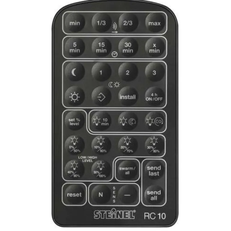 Kaukosäädin RC10 (E7501907) Steinel-tunnistinvalaisimen RS PRO LED Q1 käyttöönottoon ja asennukseen. Kaukosäätimellä voi asettaa valon kytkentäajan ja valaistuksen minimitason.