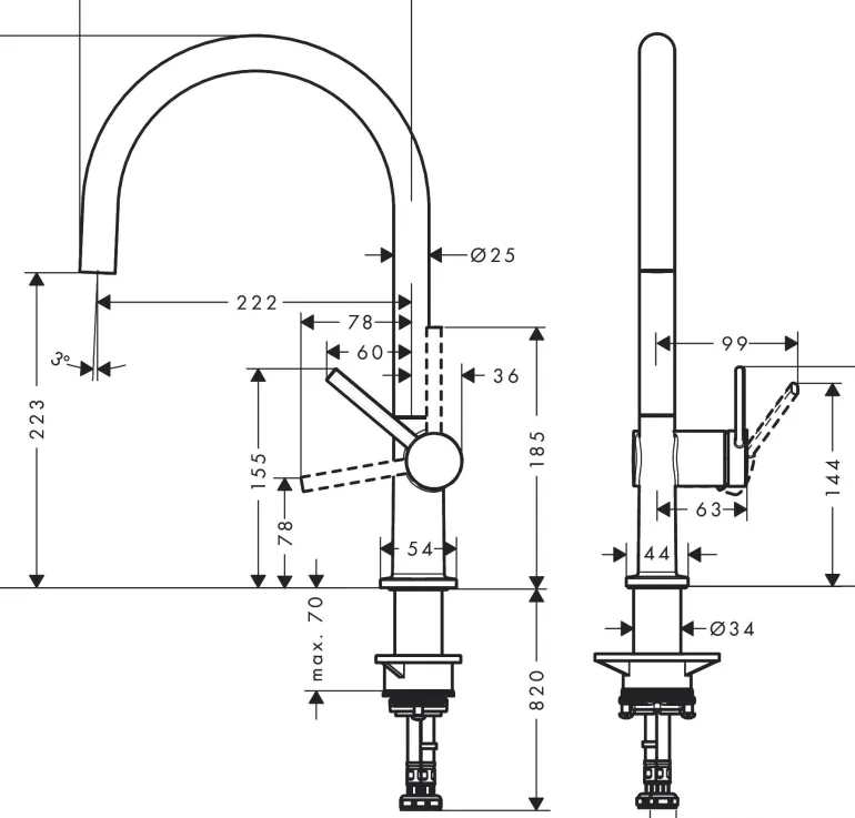 Yksivipuinen keittiöhana messinkiä. Keraaminen säätökasetti ja G ⅜ -letkuliitännät. Maksimivirtaama 3 bar: 9 l/min. Kääntösäde säädettävissä 4-portaisesti: 60°, 110°, 150° tai 360°.