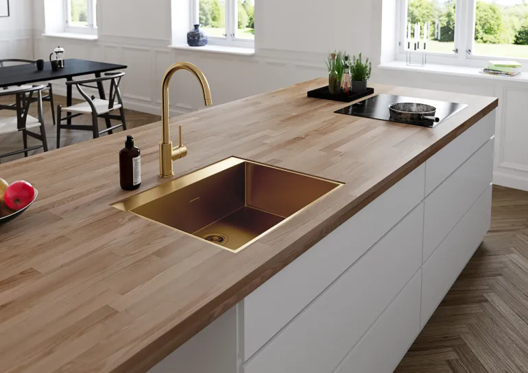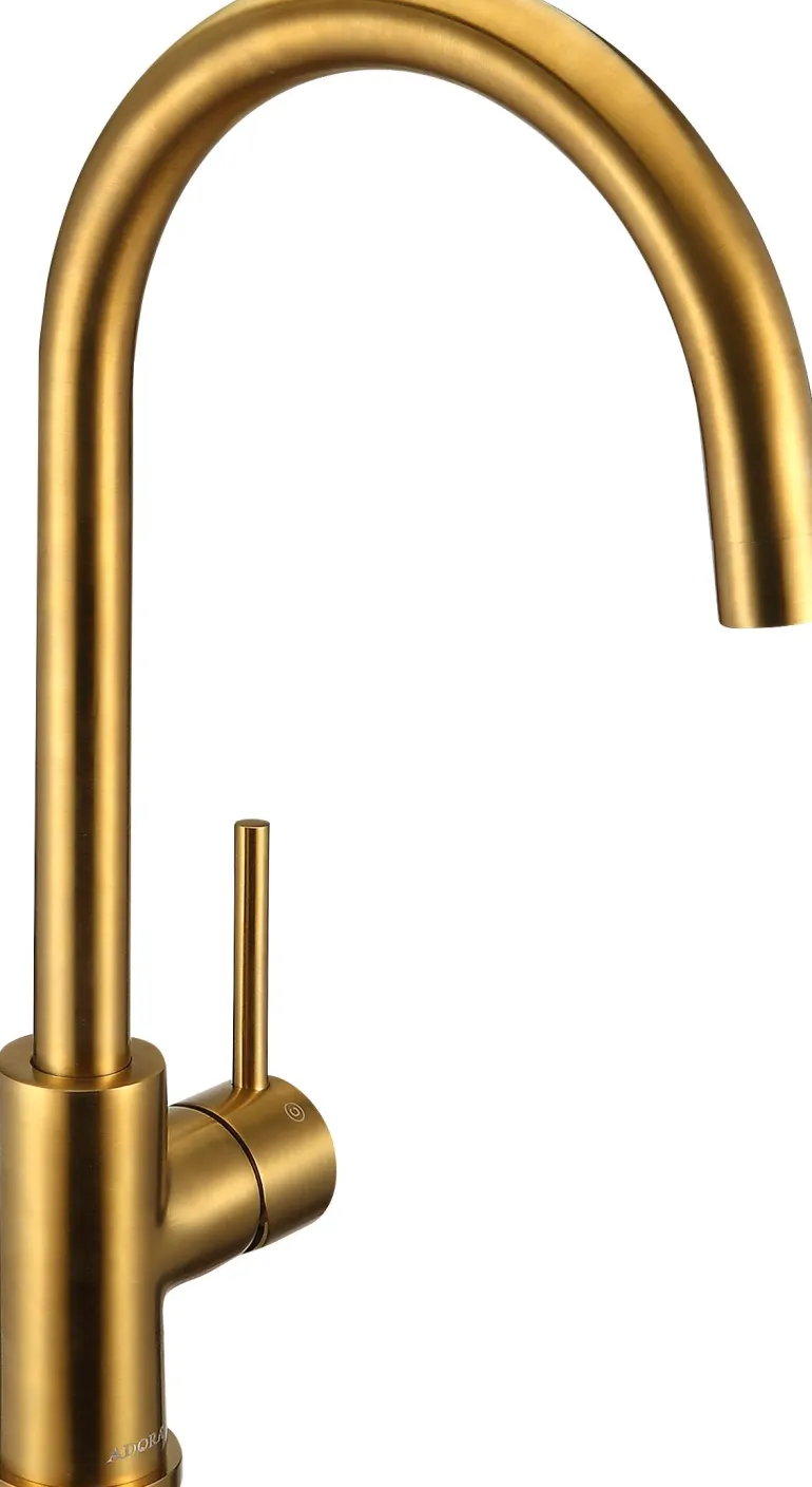 Keittiöhana, jossa on U-juoksuputki ja 35 mm:n keraaminen sisäosa. Näyttävä ja tyylikäs malli, väri harjattu kulta. Korkea U-juoksuputki tekee kattiloiden ja muiden astioiden pesemisestä helppoa. GDV-hyväksytty juomavedelle.