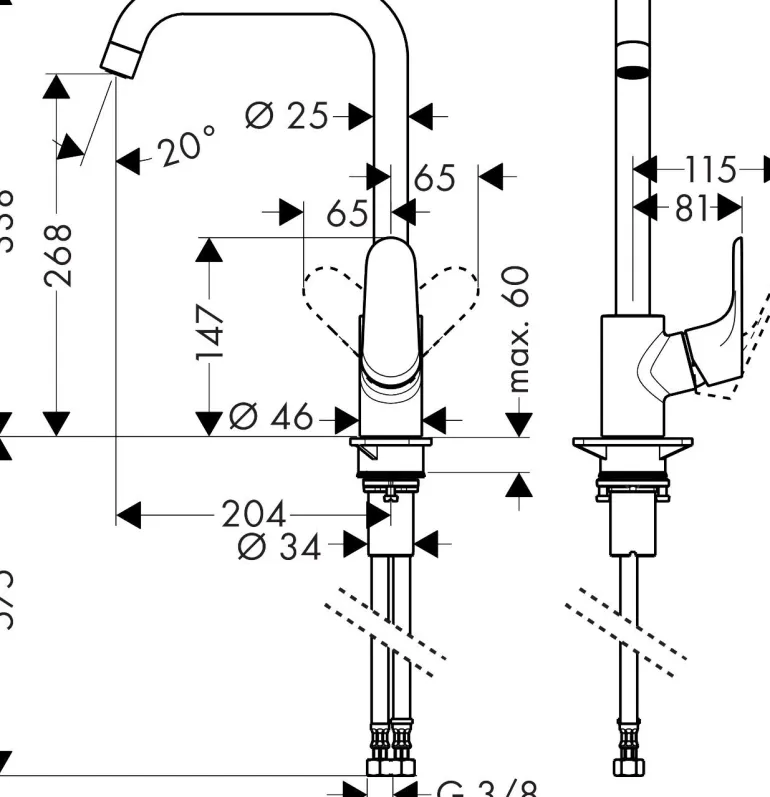 Focus yksivipuinen keittiöhana kääntyvällä juoksuputkella (110°, 150° tai 360°) ja säädettävällä lämpötilan rajoituksella.