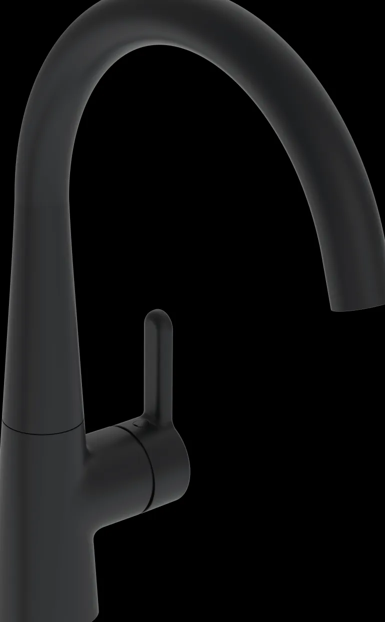 Keittiöhana, jossa älykäs pesukoneventtiili ja korkea, kääntyvä juoksuputki 120° (mahdollista rajoittaa 0° tai 60°). Pesukoneventtiili sulkeutuu automaattisesti 4 tai 12 tunnin kuluttua (yhdellä painalluksella pesukoneventtiili on auki 4 tuntia ja viiden sekunnin painalluksella 12 tuntia). Paristokäyttöinen 3 V. Joustavat kytkentäputket. Mattamusta.