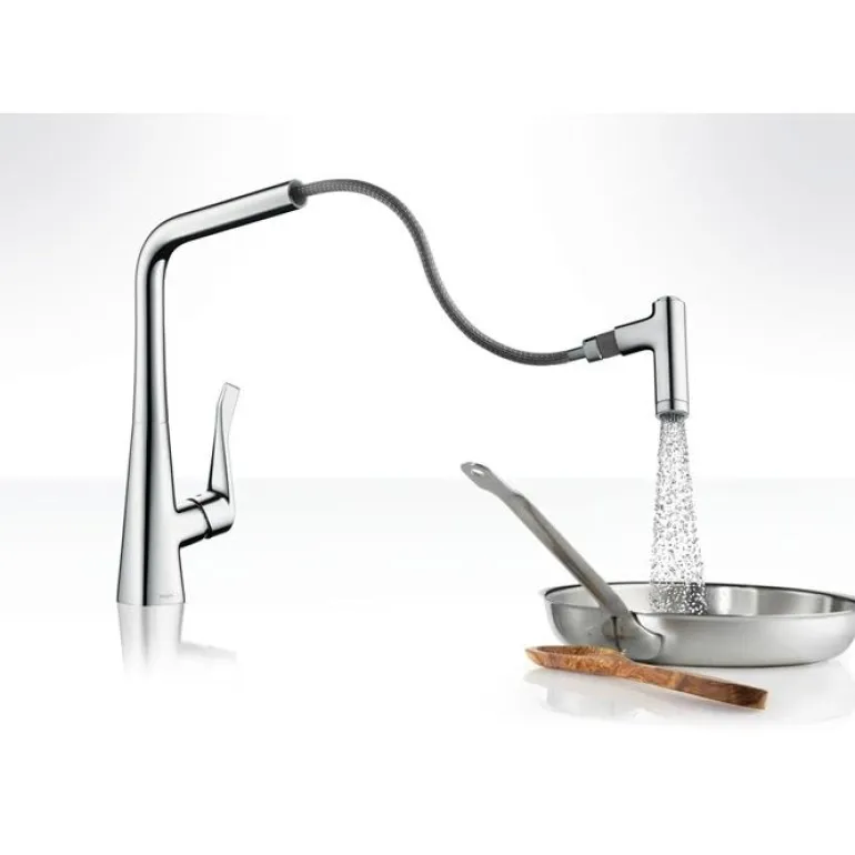 Keittiöhana, jossa on yksi kahva ja ulosvedettävä juoksuputki. Soveltuu läpivirtauslämmittimiin, ja siinä on Quick-Connect-suihkuletku ja magneettinen MagFit-suihkunpidike. Laminaari- ja suihkutoiminto.