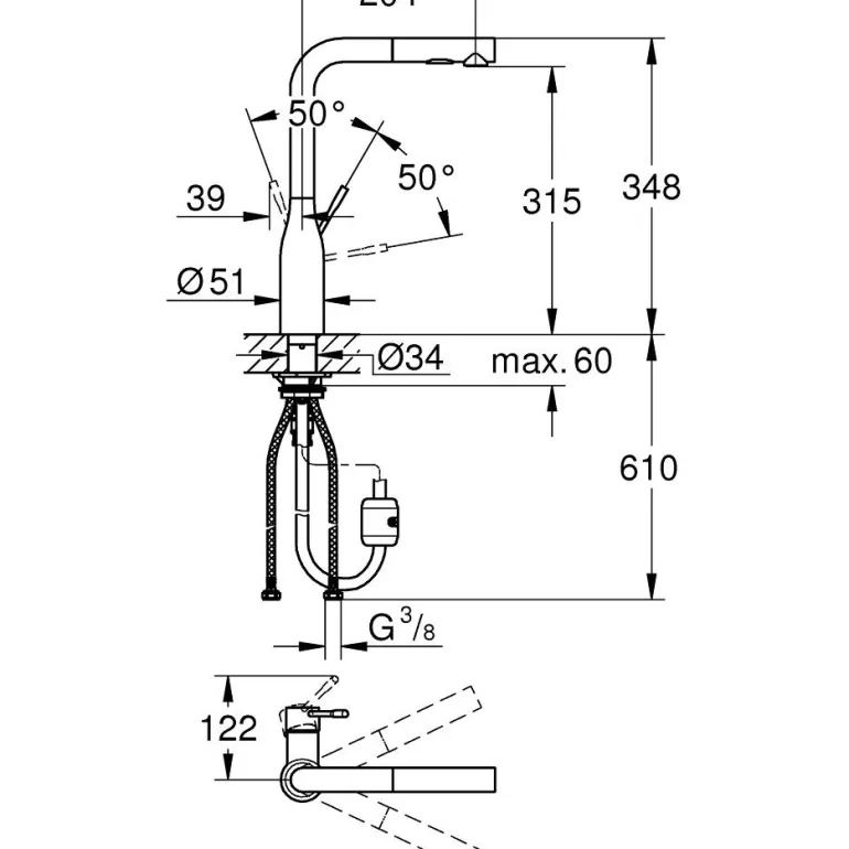 Keittiöhana korkealla L-juoksuputkella, jota voidaan kääntää 360° maksimaalisen joustavuuden saavuttamiseksi. Ulosvedettävä Comfort-suihkupää on valmistettu kestävästä metallista, ja siinä on vakio- ja tehokas suihku. Hana on valmistettu kromatusta messingistä ja sen kokonaisrakennekorkeus on 348 mm.