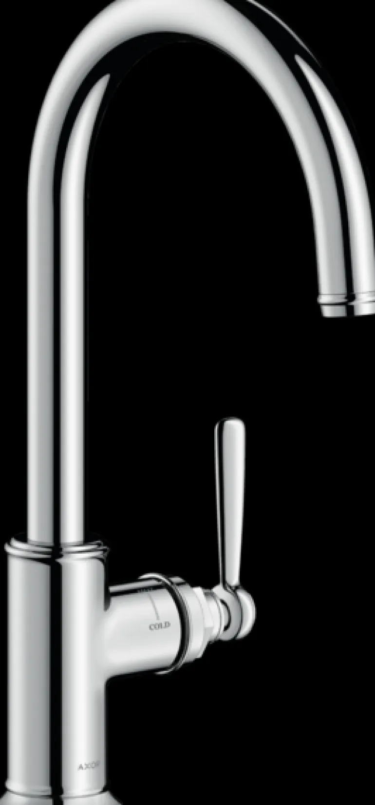 Hansgrohe Axor Montreux on kromattu keittiösekoitin korkealla juoksuputkella ja säädettävällä 3-portaisella kääntösäteellä 110°, 150° tai 360°.
