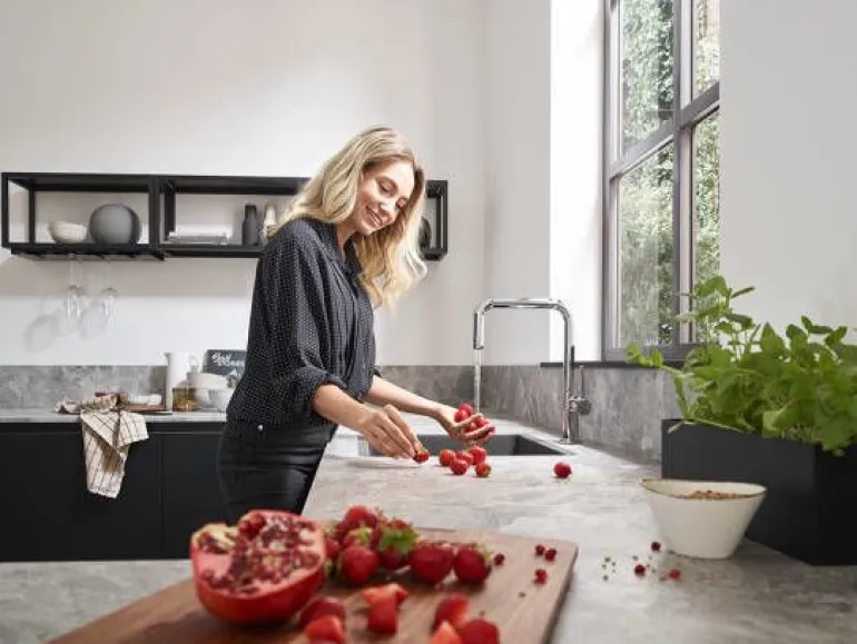 Yksivipuinen keittiöhana messinkiä. Keraaminen säätökasetti ja G ⅜ -letkuliitännät. Maksimivirtaama 3 bar: 9 l/min. Kääntösäde säädettävissä 4-portaisesti: 60°, 110°, 150° tai 360°.