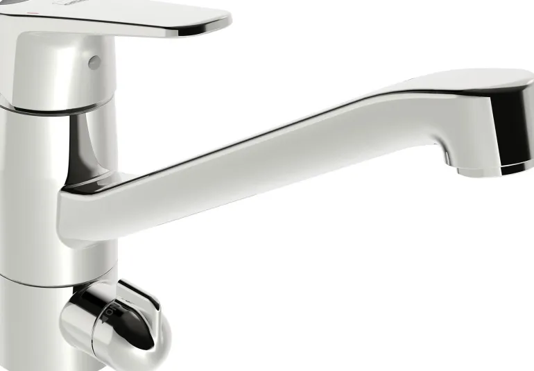 Palovammojen estolla varustettu Eco-keittiöhana, jossa on astianpesukoneliitäntä, kääntyvä juoksuputki ja poresuutin. Juoksuputken kääntösäde on asetettu 120°:seen (voidaan rajoittaa 40–80°:seen).