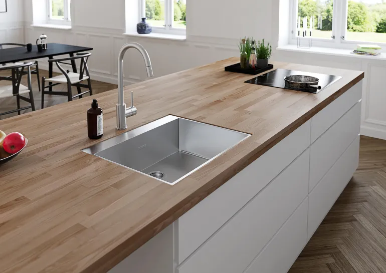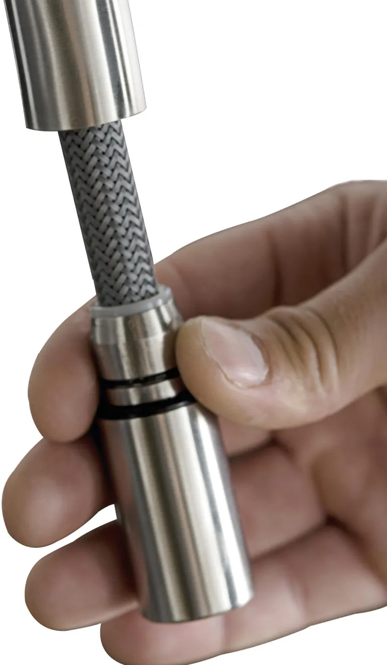 Keittiöhanassa on korkea U-putki ja joustava ulosvetotoiminto, joka helpottaa patojen ja astioiden pesua. Putkea voidaan vetää ulos enintään 70 cm. Hanassa on 35 mm:n keraaminen sisäosa ja liitosletkut pehmeää metallikäärittyä PEX-materiaalia, 500 mm. Ruostumattomasta teräksestä valmistettuja tuotteita on huollettava teräksenhoitoaineilla.