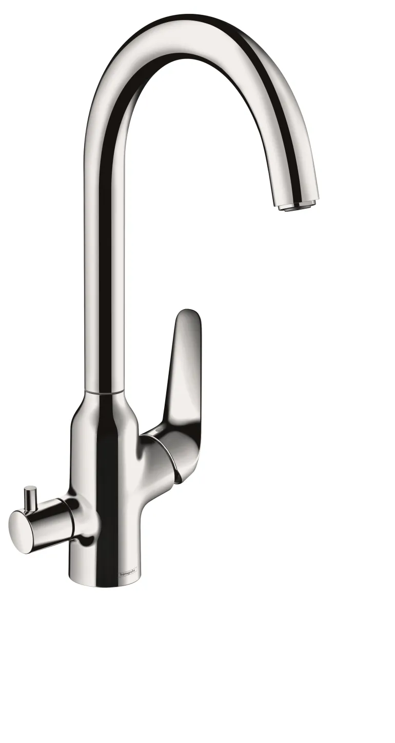 Kromattu keittiöhana, jossa astianpesukoneen sulkuventtiili ja säädettävä kääntösäde kahdessa vaiheessa (110° tai 360°). Hanassa on säädettävä lämpötilarajoitus ja sen maksimivirtaama on 10 l/min (3 baarin paineella).