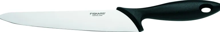 Monikäyttöinen Fiskars Essential -keittiöveitsi ruostumattomasta teräksestä, joka soveltuu moniin erilaisiin leikkuutehtäviin.