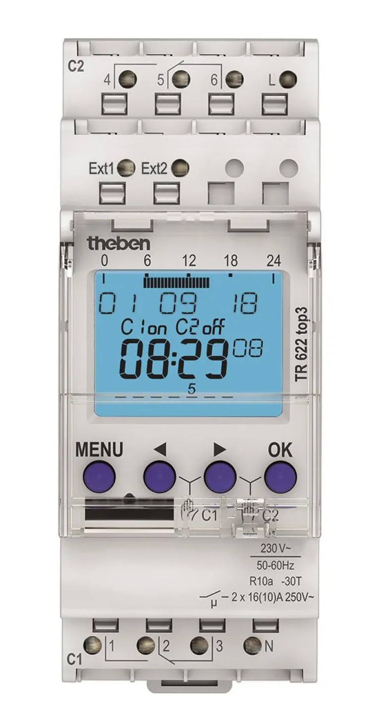 Digitaalinen kellokytkin TR 622 top 3 viikko-ohjelmalla, 2 kanavalla ja 3 erikoisohjelmalla. Pieni vuosiohjelma ja 2 ulkoista tuloa. Digitaalinen kellokytkin 2 kanavalla.
