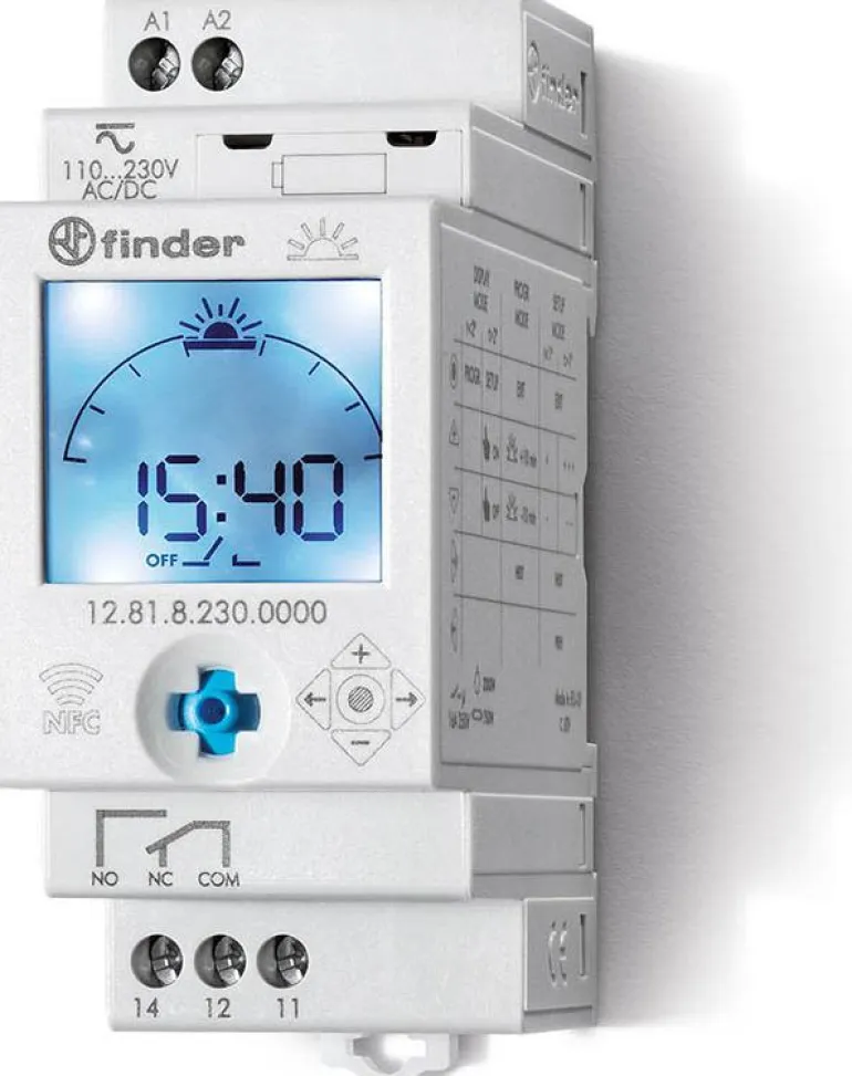 Astronominen kellokytkin ohjelmoidaan NFC:llä ja/tai ohjaussauvalla. Suuri taustavalaistu näyttö. 30 minuutin aikaväli. Helposti saatavilla oleva, vaihdettava akku. Muistipaikkoja 50.