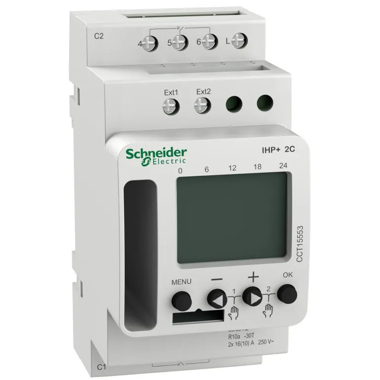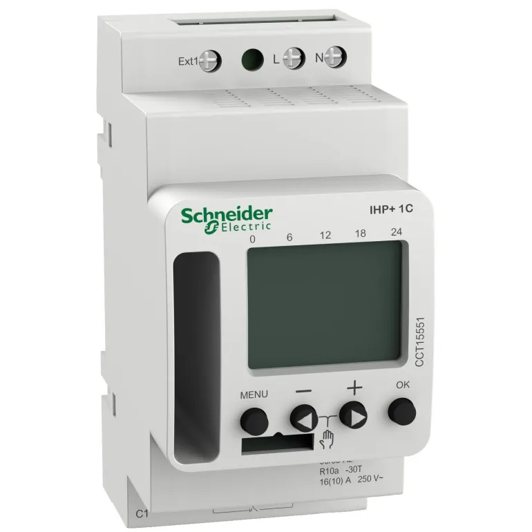 Schneider Electric CCT15551 Acti9 IHP+ -kellokytkin ohjelmoitavissa. Ohjelmoitavissa älypuhelimen kautta yhdessä tuotteen CCT15862 kanssa.