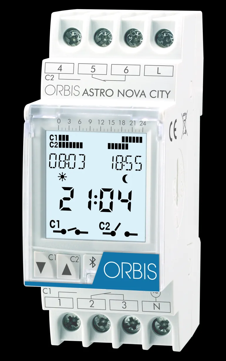 Digitaalinen hämärärele astrotoiminnolla. Valitse lähin kaupunki valikosta ja valaistusta ohjataan automaattisesti suhteessa auringonnousuun ja -laskuun.