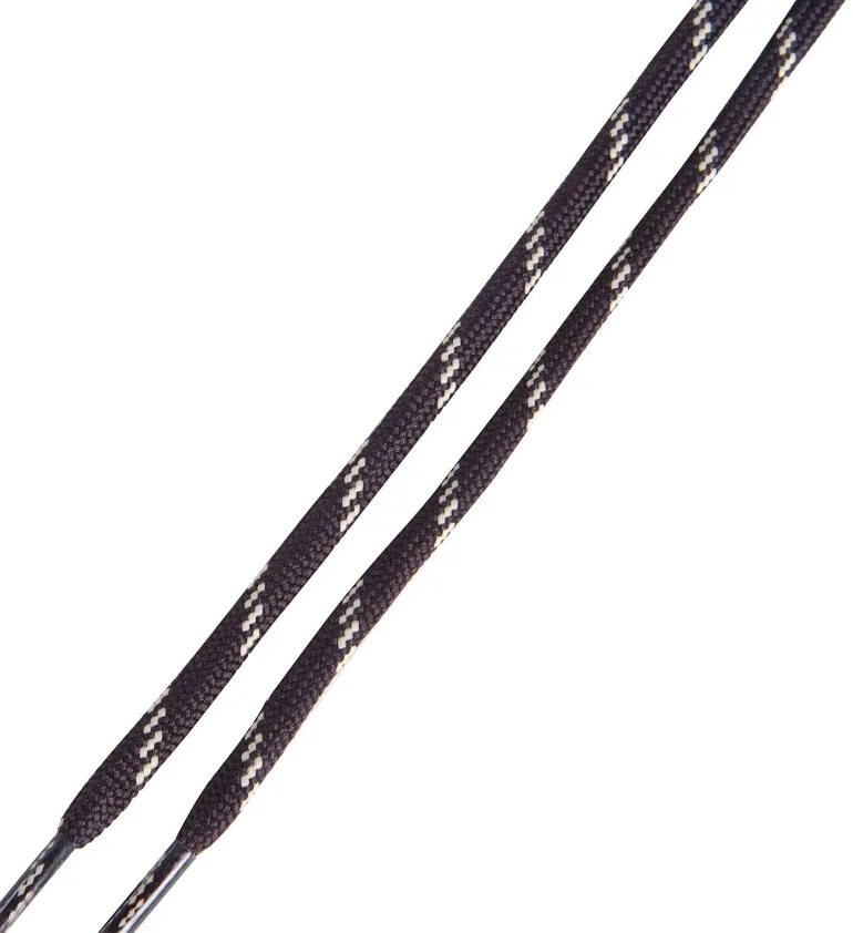 Vahvasta ja joustavasta polyesteristä valmistettu kengännauha. Nauha on musta, valkoiset koristeet.