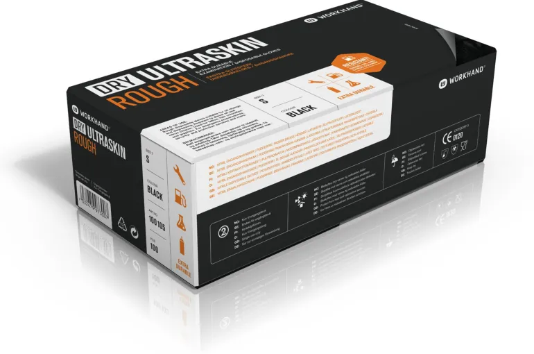 Workhand DRY ROUGH on kestävä kertakäyttöinen musta nitriilikäsine, joka kestää teollisuuden kemikaaleja, grillirasvaa, mehun valmistuksessa syntyvää sitruunahappoa ja äyriäisten käsittelyä. Yleisiä käyttökohteita: moottori-, vene- ja konepalvelut, teollisuus ja kuljetuspalvelut, turva- ja turvatoimet, tatuointi, graafinen tuotanto ja kovat keittiöympäristöt.