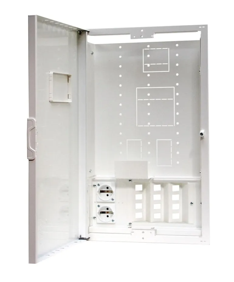 Teräslevykeskus uppoasennukseen, 3 riviä, 42 moduulia, medialle, ilman pohjakoteloa. Teräslevykeskus ilman pohjakoteloa, 12 RJ45-liitinpaikkaa ja hyllyt modeemeille. Keskuksessa on wifi-ikkunat, jotka varmistavat wifi-signaalien ulostulon. Keskuksen suunnittelussa on huomioitu hyvä ilmanvaihto, koska komponentit tuottavat paljon lämpöä.