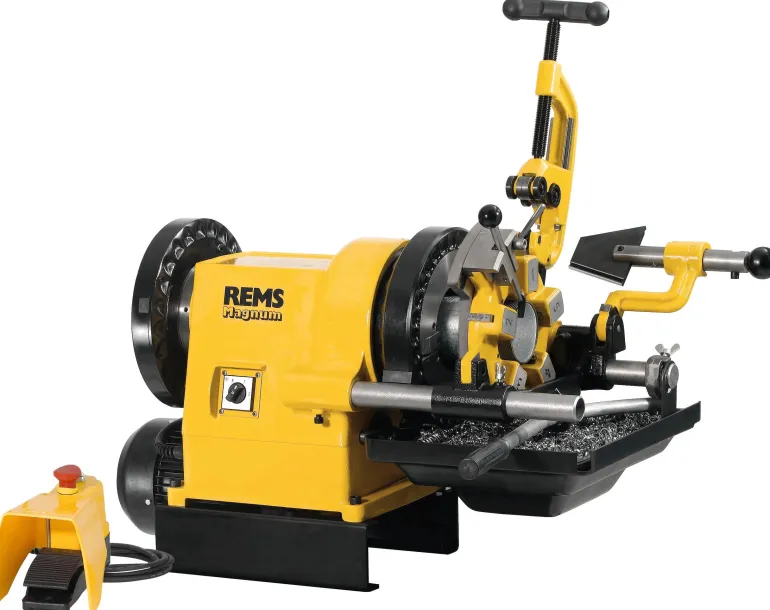 Putkikierrekone putkikierteille (1/16) ½ – 3″, 16 – 63 mm ja pulttikierteille (6) 18 – 60 mm, ½ – 2″. Magnum 3010 L-T -mallissa on irrotettava iso öljysäiliö, lastuastia ja kääntönapakondensaattorimoottori 230 V, 50 Hz, 2100 W. Huoltovapaa käyttömekanismi, jalkaturvakytkin hätäpysäytyksellä, luotettava, itsekiristyvä pikaistukka, takakeskitysistukka ja automaattinen voitelujäähdytys. Työkalusarjassa on automaattinen yleiskierrepakka kaikille kierteille, myös pitkille kierteille, automaattinen avautuminen, kierteen pituuden automatiikka kartiokierteelle, leikkuuleuat putkenkierteelle, kartio ISO 7-1, EN 10226 (DIN 2999, BSPT) R oikea, putkileikkuri, putken viisteytystyökalu sisäpuoliseen purseenpoistoon ja painovipu. Käytetään työpöydällä, jalustassa (ei sisälly), siirrettävässä ja taitettavassa pyöräjalustassa (ei sisälly) tai siirrettävässä pyöräjalustassa (ei sisälly).