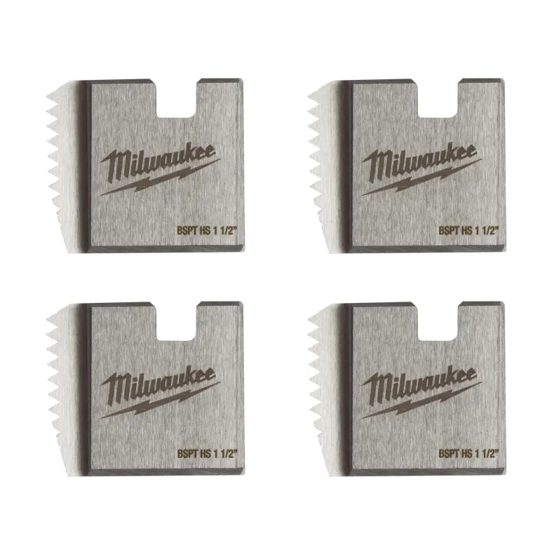 Milwaukee 4932480237 on 4-osainen sarja kierreleukoja (FPTD 1-1/2″ BSPT HS) käytettäväksi Milwaukee -kierteityskoneiden kanssa. HS-leuat parhaan suorituskyvyn saavuttamiseksi ruostumattomissa teräsputkissa.