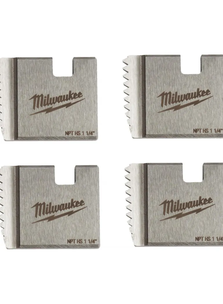 Milwaukee 48361110 on 4-osainen sarja kierreleukoja (FPTD 1-1/4″ NPT HS) käytettäväksi Milwaukee -kierteityskoneiden kanssa. HS-leuat parhaan suorituskyvyn saavuttamiseksi ruostumattomissa teräsputkissa.