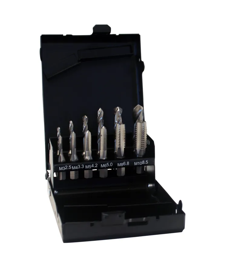 Sarja, jossa kuusi kierretappia M3-M10 1/4″ kiinnityksellä sekä kuusi poraa 1/4″ kiinnityksellä. Jokaiseen kierrekokoon sopivat porat. Huolto-, korjaus- ja kunnossapitotöihin. Suora kiinnitys sähkökäyttöisin käsityökaluihin.