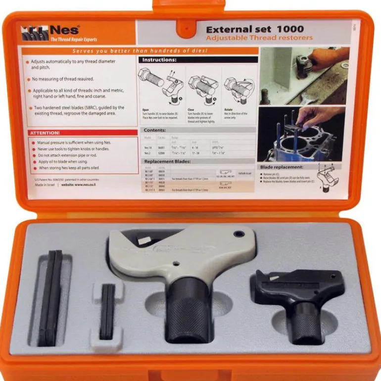 NES 1000 on kierteen korjaussarja, joka sisältää kierteen korjaustyökalun ulkokierteiden korjaamiseen. Toimitetaan kätevässä säilytyslaatikossa.