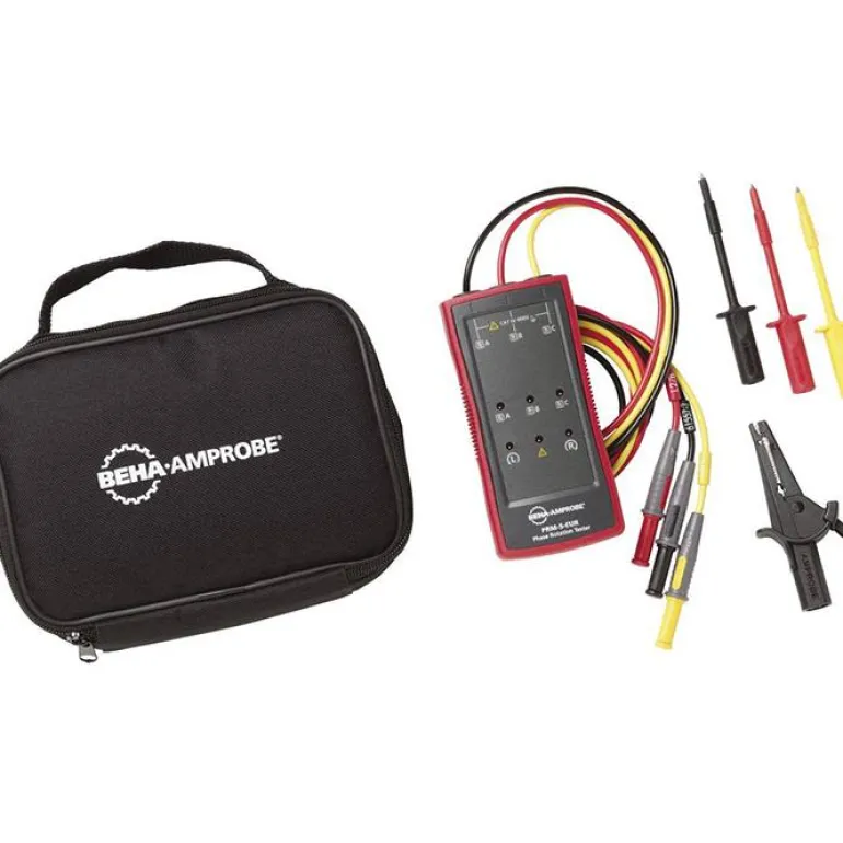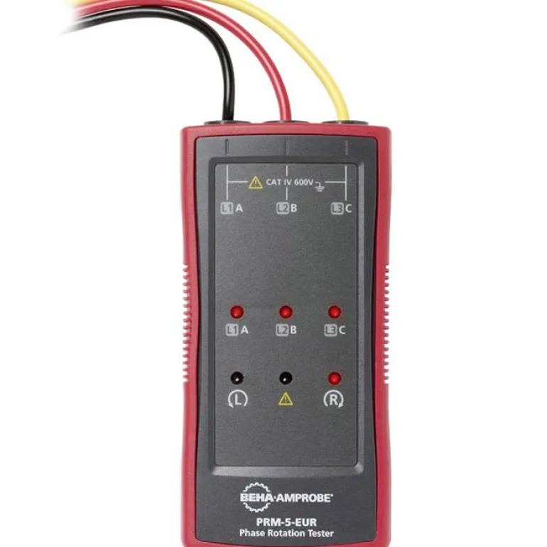 Beha-Amprobe PRM-5-EUR on kiertosuuntamittari moottorin kierroslukujen ja pyörimissuunnan tarkistamiseen enintään 700 V sähköjärjestelmissä. PRM-5 toimii ilman paristoja ja on luotettava mittari oikean kiertosuunnan tarkistamiseen kolmivaiheisissa johdoissa ja pistorasioissa.