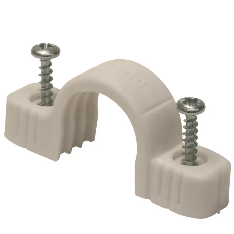 Kiinnike valkoisesta PP-GF20-muovista, sopii suojaputkien kiinnittämiseen. Saatavana yksin- tai kaksinkertaisena.