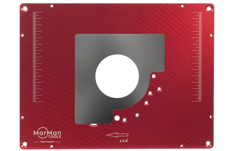 Kiinnityslevy IP2.0-B pienennyslevyillä. Esiporattu monille Bosch-jyrsimille. Alumiinia, jonka paksuus on 9 mm, erinomainen vakaus, kestävyys ja tasaisuus. Korkealaatuiset sinkityt 2 mm:n pienennyslevyt, joissa on leikkausaukot Ø 32 ja 68 mm.