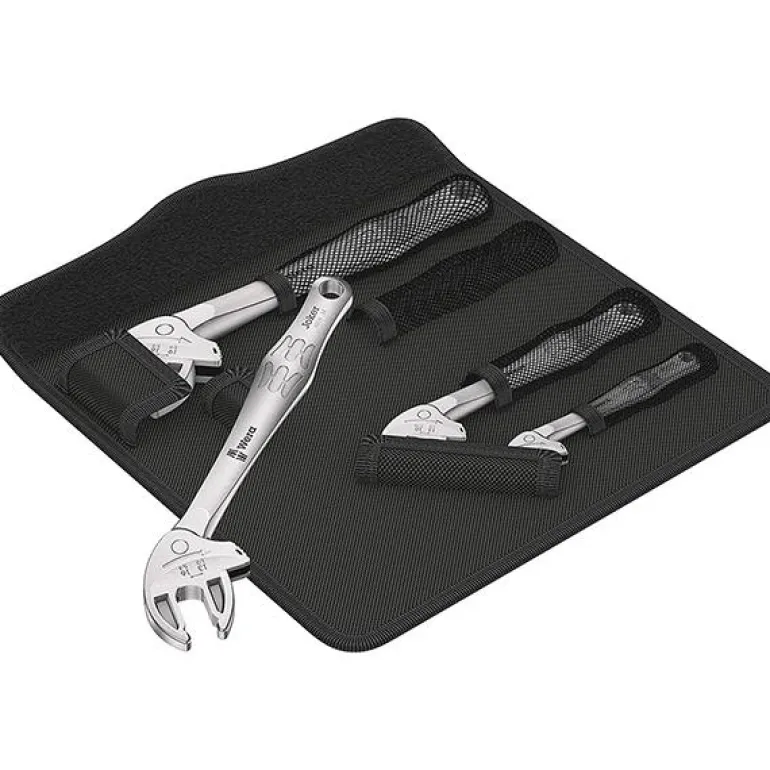 Wera 6004 Joker on 4-osainen kiintoavainsarja, jossa U-avaimet on yhteenkerättynä käytännölliseen kangaskoteloon. Integroitu vipumekanismi kiinnittää kuusioruuvin tai -mutterin tukevasti leukojen väliin, mikä vähentää merkittävästi luiskahtamisen ja vahinkojen vaaraa. Räikkätoiminto takaa nopean ja sujuvan ruuvauksen ilman irrottamista ruuvista tai mutterista. Leukojen pienen hammastuksen ansiosta palautuskulma on vain 30°.