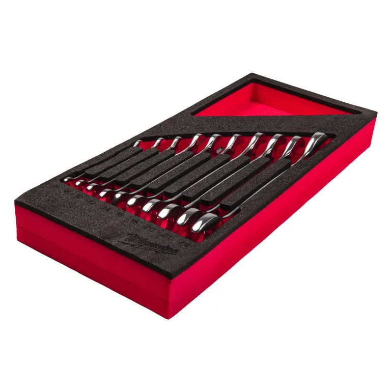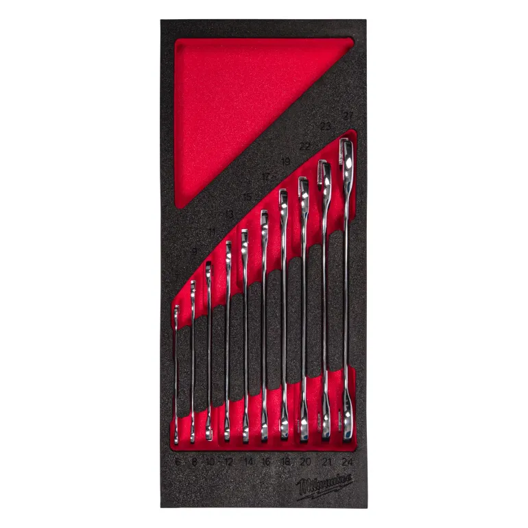 10-osainen kiintoavainsarja laadukkaassa vaahtomuovialustassa. Kaksipäisten kiintoavaimien pyöristetyt I-Beam-kahvat takaavat mukavan otteen ja ohut pään muotoilu mahdollistaa pääsyn ahtaisiin työtiloihin. Mustetäytetyt kokomerkinnät helpottavat ja nopeuttavat koon tunnistamista ja kromipinnoite estää kulumisen ja ruostumisen.