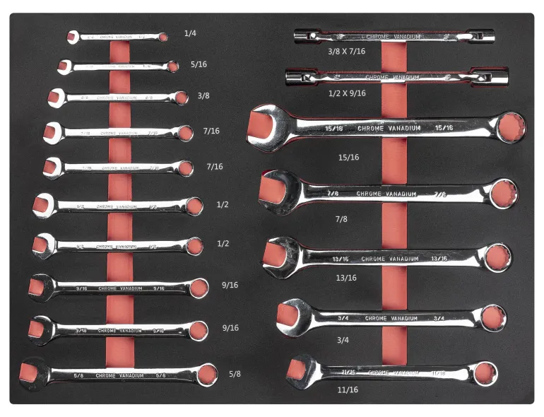 Kiintolenkkiavaimet: 1/4″, 5/16″, 3/8″, 2 kpl 7/16″, 2 kpl 1/2″, 2 kpl 9/16″, 5/8″, 15/16 ”, 13/16″, 3/4″ ja 11/16”