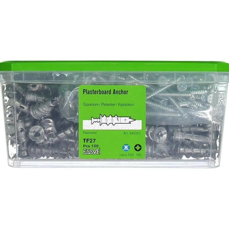 Essve 645050 on 100 kpl kipsiankkureita 4,5 x 50 mm, itseporautuva. Nopeisiin ja varmoihin asennuksiin kipsilevyihin sekä kipsistä tai polyuretaanista valmistettuihin elementtiseiniin.
